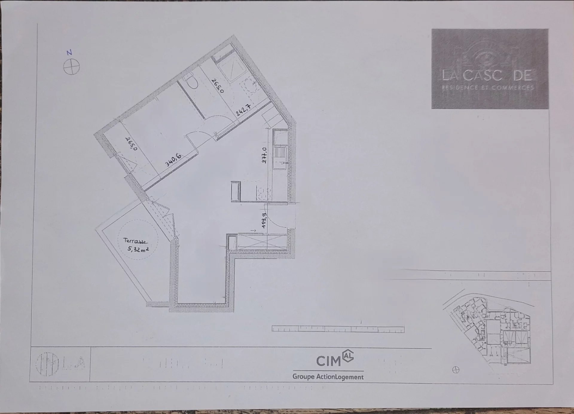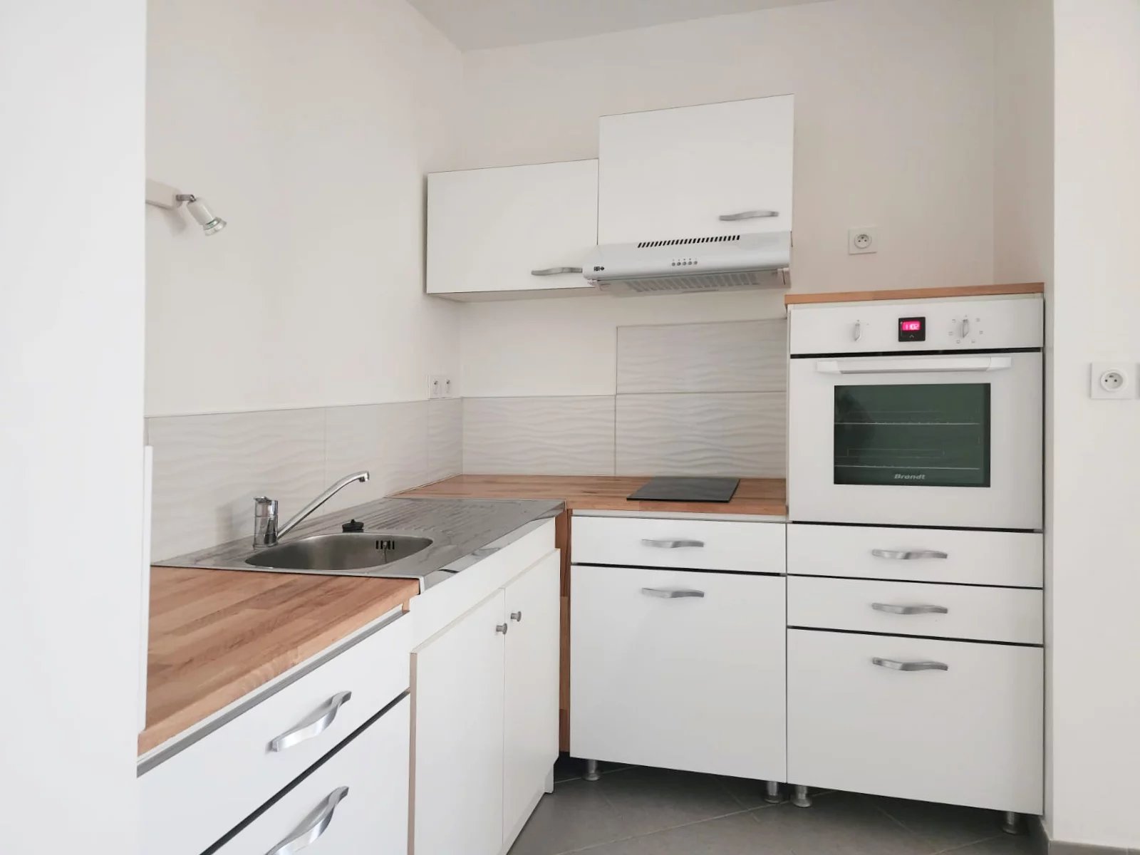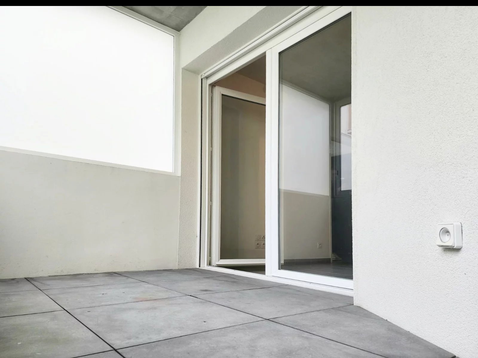 Bel appartement de type T1 en location au 1er étage d'un immeuble en copropriété avec ascenseur, comprenant : 1 pièce, kitchenette, 1 salle d'eau et 1 WC, terrasse fermée.